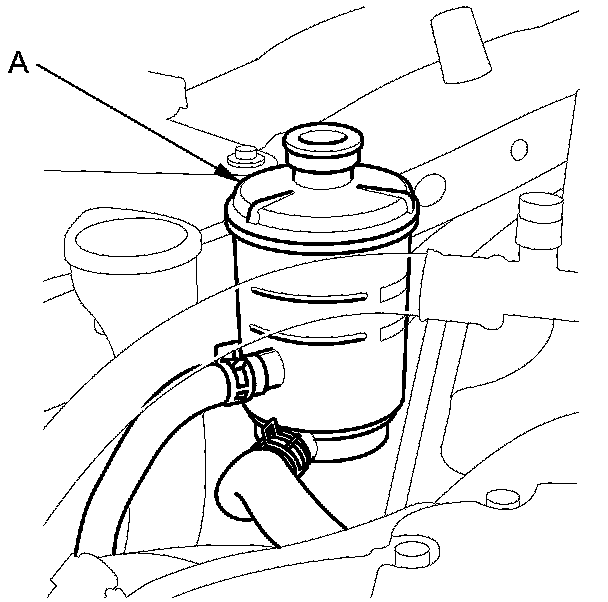 1. Remove the reservoir from its holder. Raise the reservoir, then disconnect the return hose (A) to drain the reservoir. Take care not to spill the fluid on the vehicle. Wipe off any spilled fluid at once.
