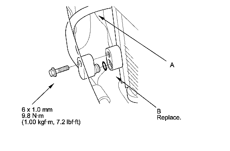 4. Remove the bolt, then disconnect the front receiver line (A) from the A/C condenser. Remove the O-ring (B).