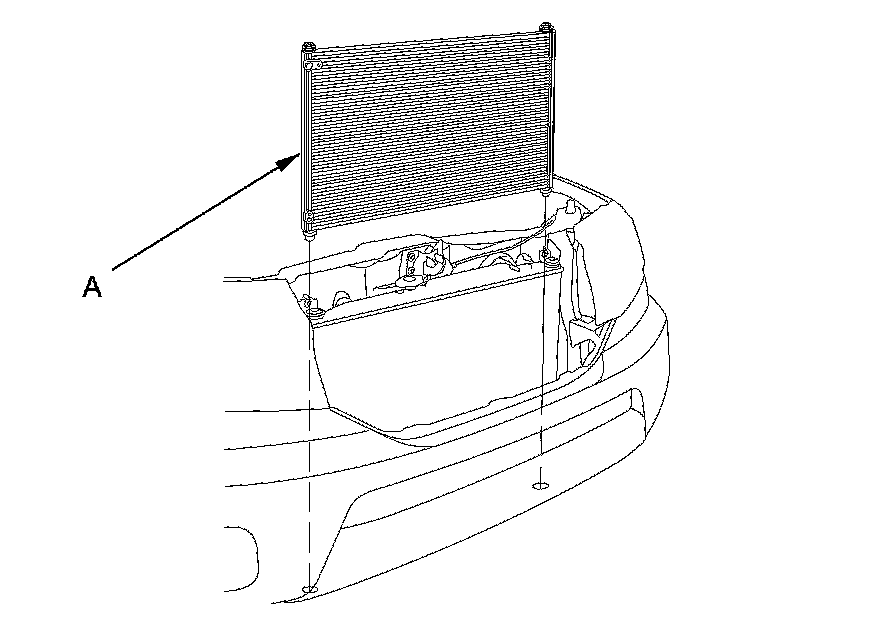 7. Remove the A/C condenser (A) by lifting it up. Be careful not to damage the radiator and A/C condenser fins when removing the A/C condenser.