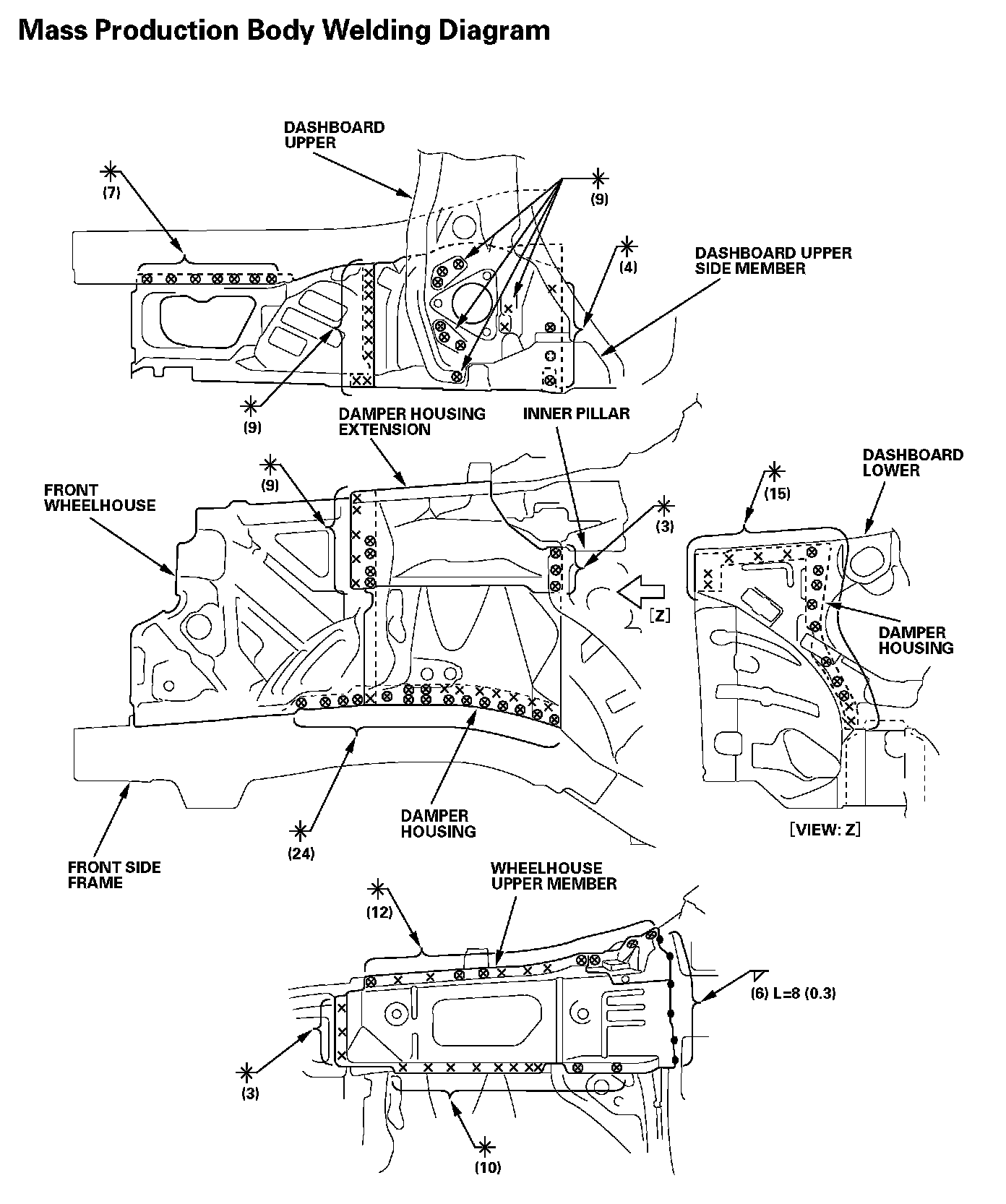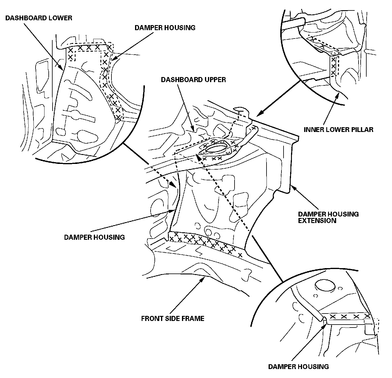 - Weld the damper housing and front side frame (E).