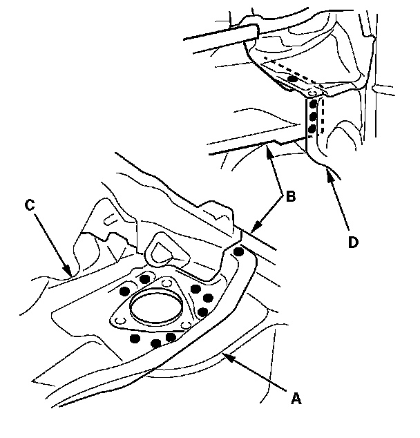 - Weld the damper housing (A) and damper housing extension (B) to the dashboard upper (C) and inner lower pillar (D).