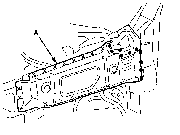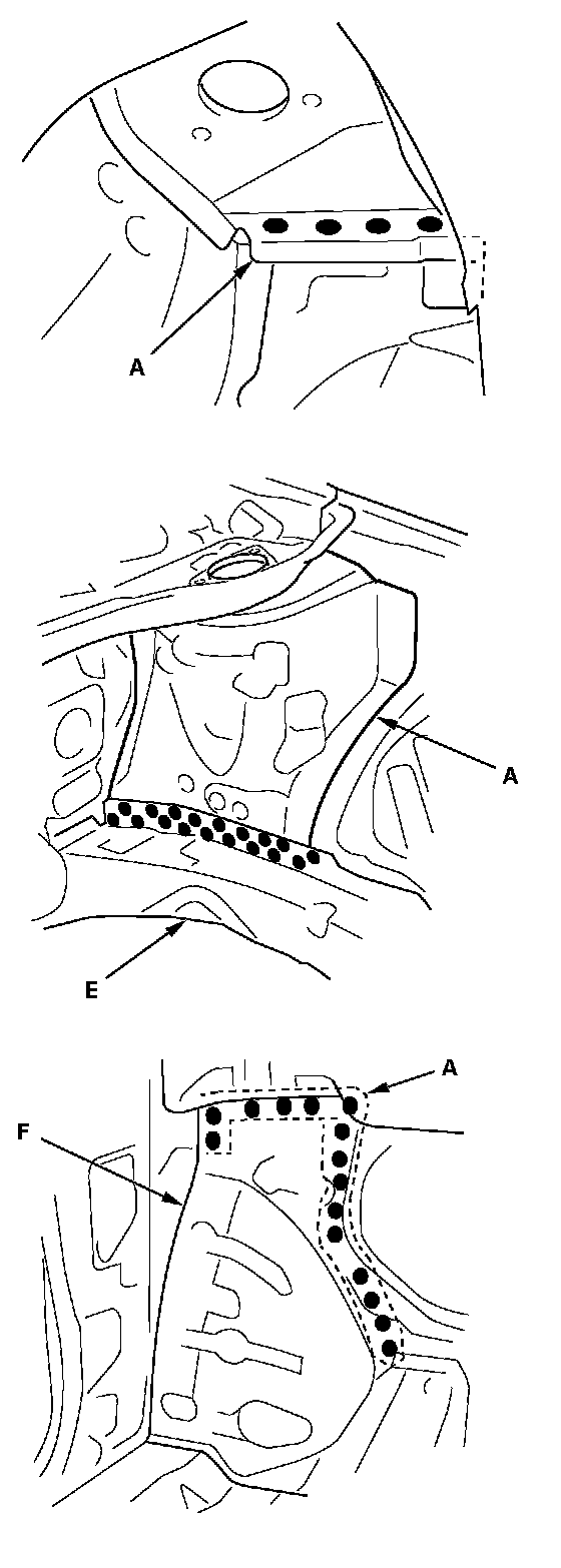 - From the passenger's side, plug weld the holes in the dashboard lower (F), damper housing.