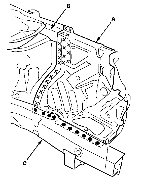 6. Weld the front wheelhouse (A) to the damper housing (B) and front side frame (C).