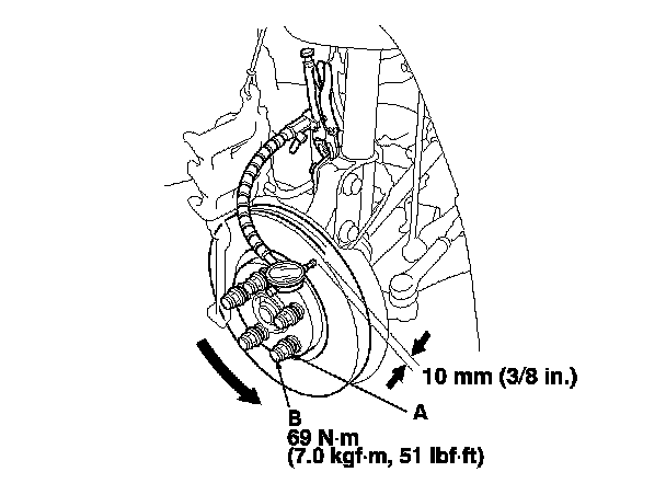5. Install suitable flat washers (A) and wheel nuts (B), and tighten the nuts to the specified torque to hold the brake disc securely against the hub.