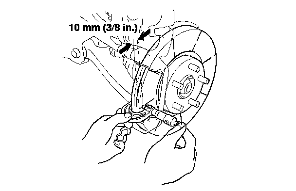 6. Set up the dial gauge against the brake disc as shown, and measure the runout at 10 mm (3/8 in.) from the outer edge of the brake disc.