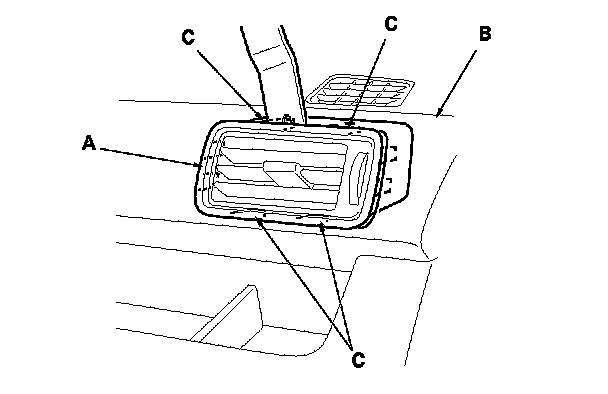 4. Insert the appropriate trim tool into the gap between the dashboard vent (A) and the dashboard (B), and release the hooks (C).