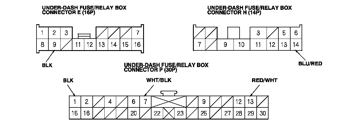 6. Reconnect the connectors to the under-dash fuse/relay box. Turn the ignition switch to ON (II) and do these input tests at the following connectors on the under-dash fuse/relay box.