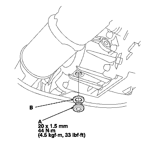 4. Reinstall the drain plug with a new sealing washer (B).