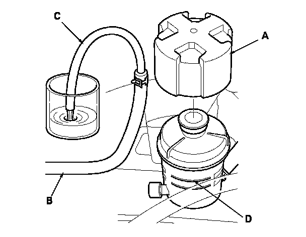 2. Connect a hose (C) of suitable diameter to the disconnected return hose, and put the hose end in a suitable container.
