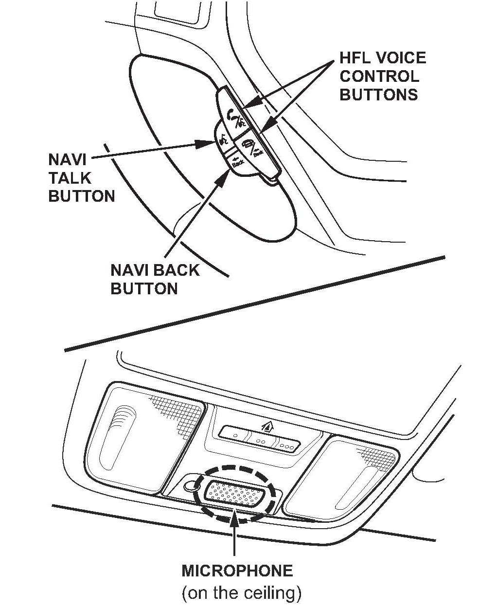 The navigation system features a voice control system that allows you to operate most of the navigation and audio functions with only your voice. To interact with the navigation system, use the NAVI TALK and NAVI BACK buttons. The microphone is located in the ceiling. This is the primary way to give commands to the system.