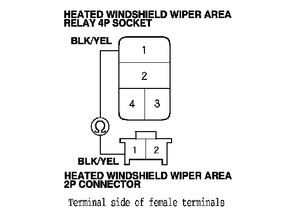 - An open in the BLK/YEL wire between the heated windshield wiper area relay and heated windshield wiper area.