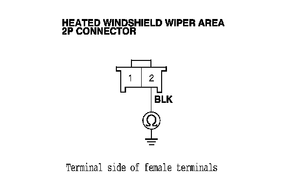 6. Check for continuity between heated windshield wiper area 2P connector terminal No. 2 and body ground.