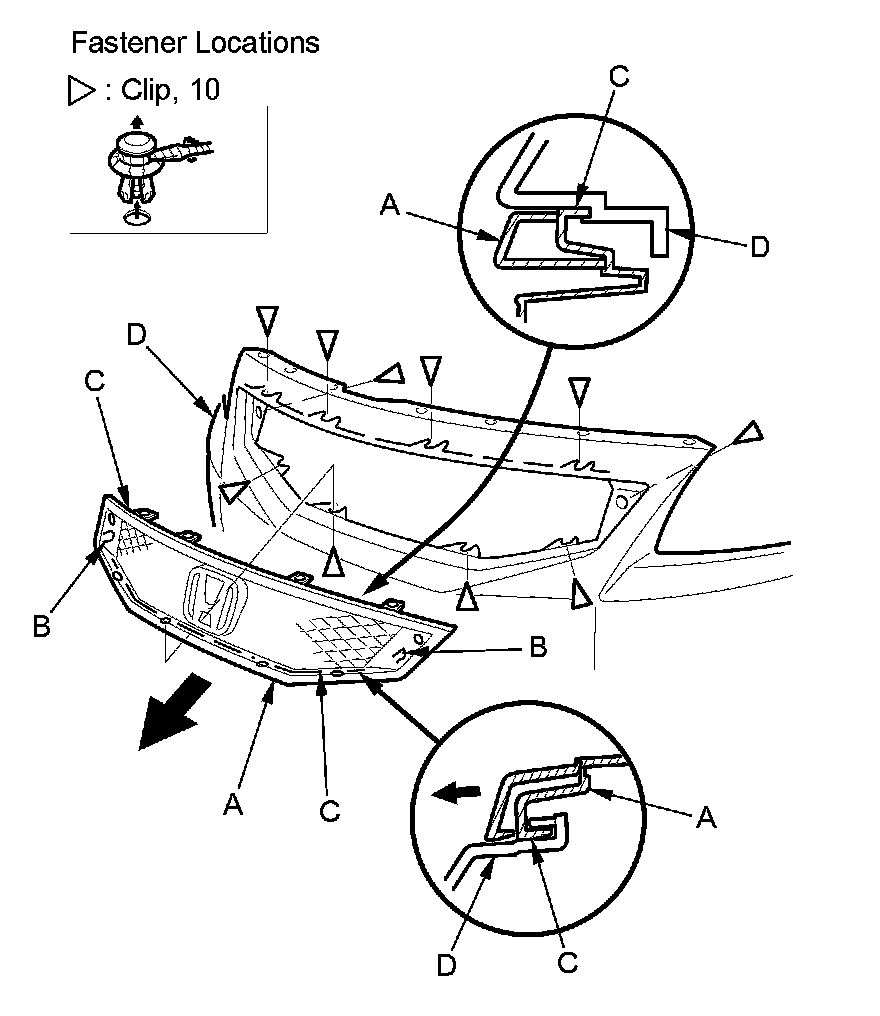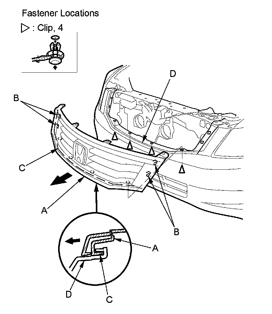 2. Release the hooks (B) and the ribs (C) from the front bumper (D).
