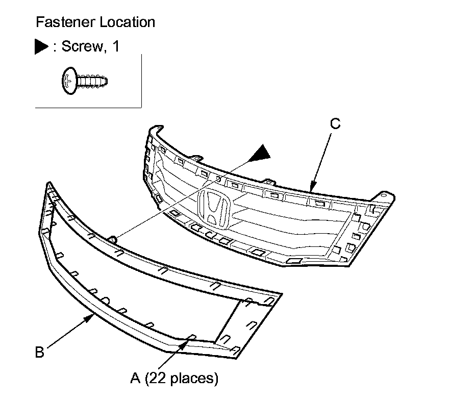 2. Remove the screw, and release the hooks (22 places) (A) with a flat-tip screwdriver, then remove the front grille molding (B) from the front grille base (C).