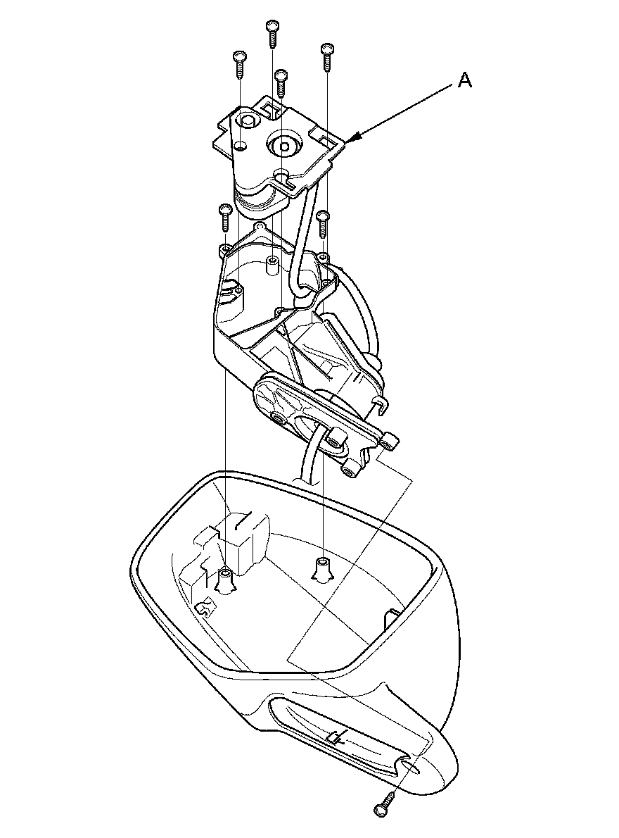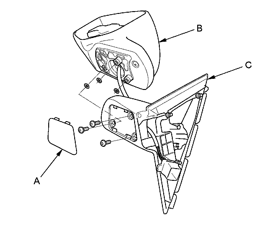 8. Remove the three screws, and separate the mirror housing (B) from the bracket (C).