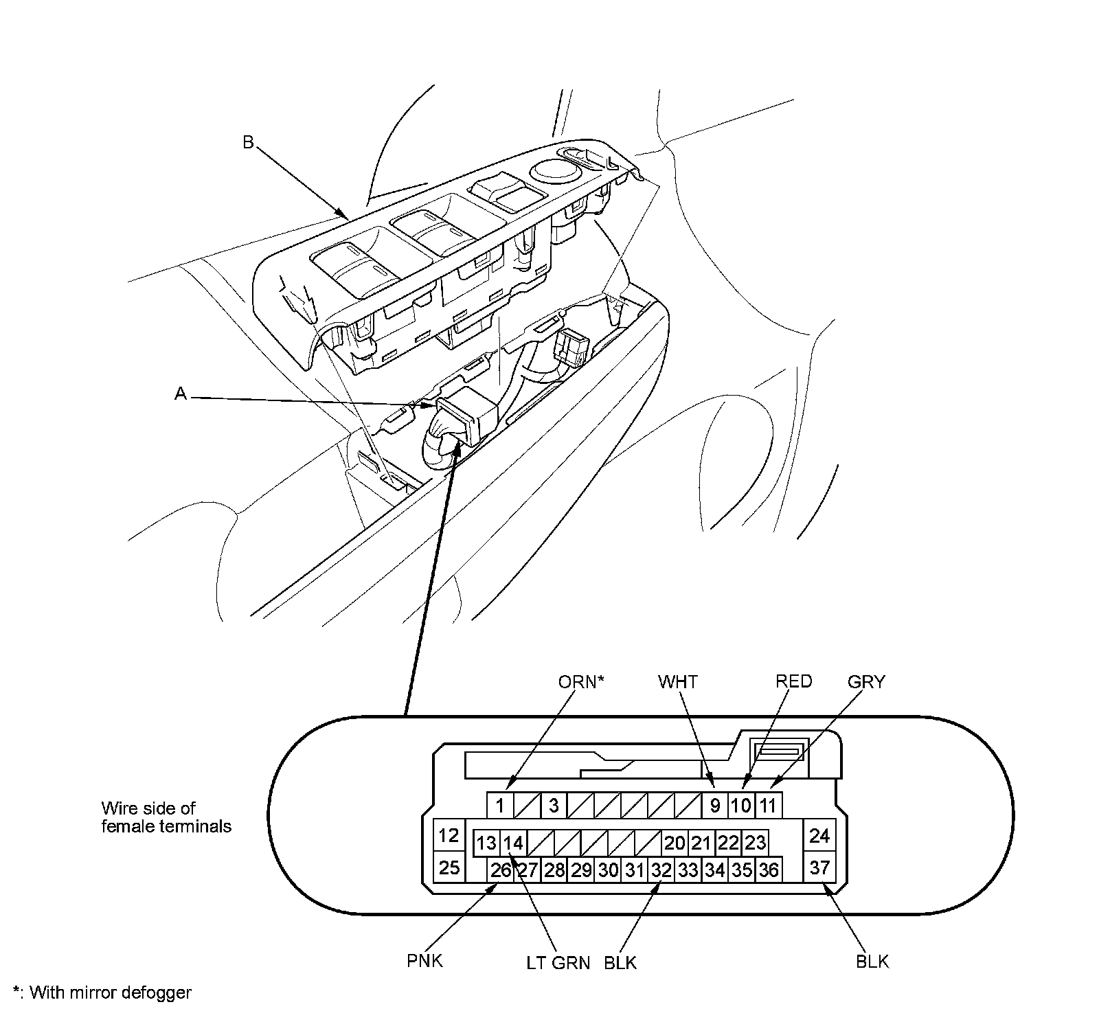 2. Disconnect the 37P connector (A) from the power window master switch (B).