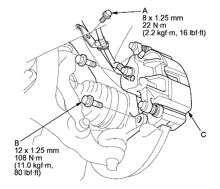 4. Remove the brake caliper bracket mounting bolts (B), then remove the caliper assembly (C) from the knuckle. To prevent damage to the caliper assembly or the brake hose, use a short piece of wire to hang the caliper assembly from the undercarriage. Do not twist the brake hose excessively.