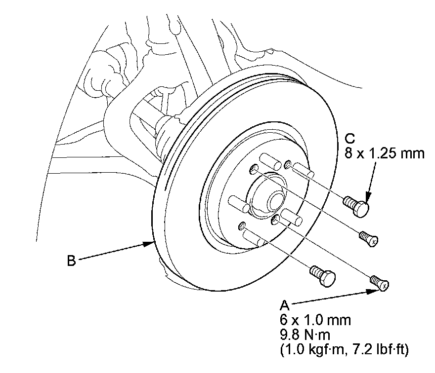 NOTE: If the brake disc is stuck to the front hub, thread two 8 x 1.25 mm bolts (C) into the brake disc to push it away from the front hub. Turn each bolt 90 degrees at a time to prevent the brake disc from binding.