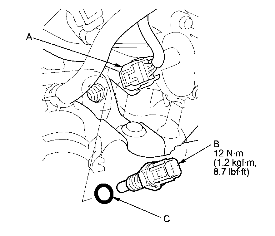 Install the parts in the reverse order of removal with a new O-ring (C), then refill the radiator with engine coolant