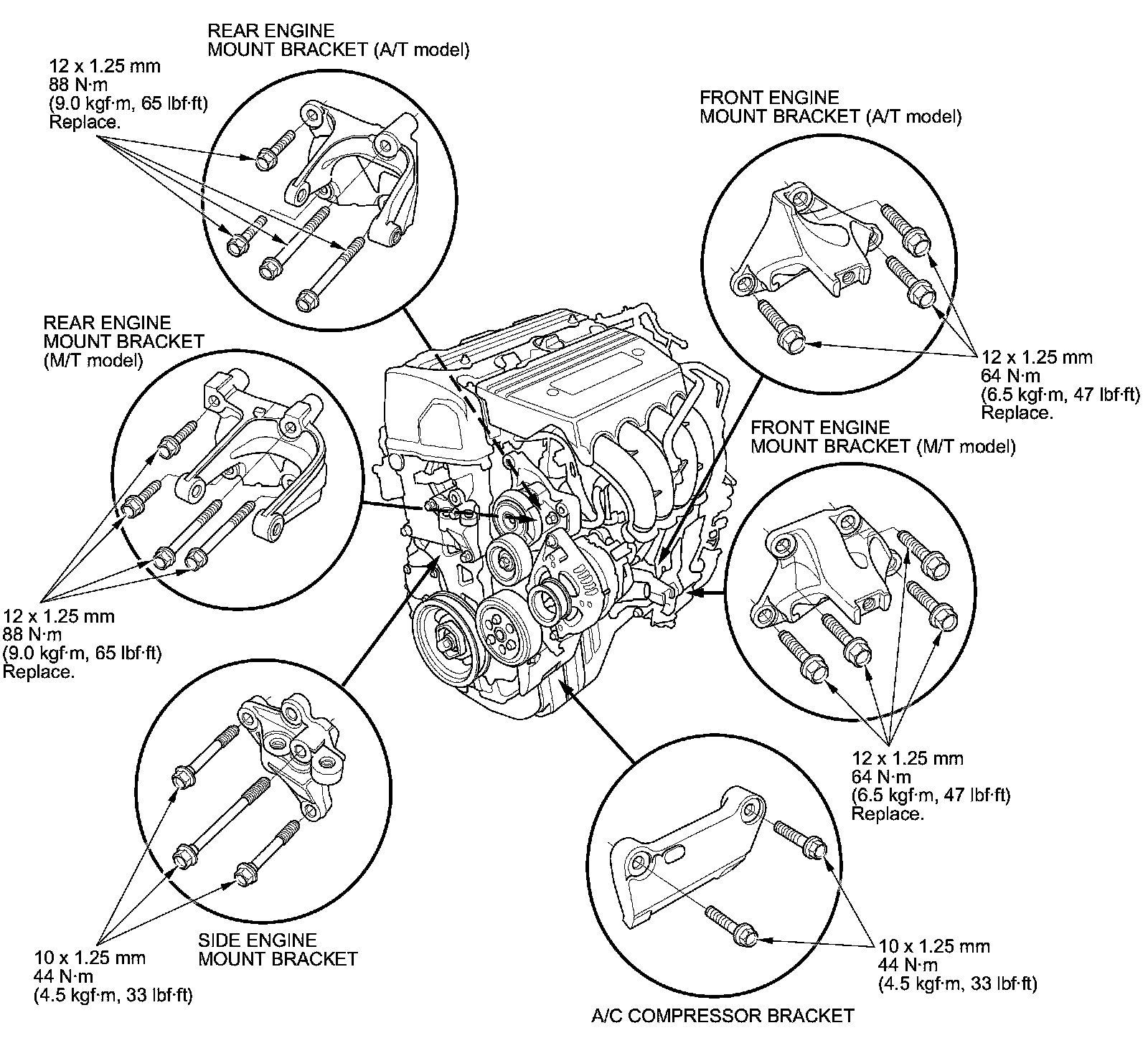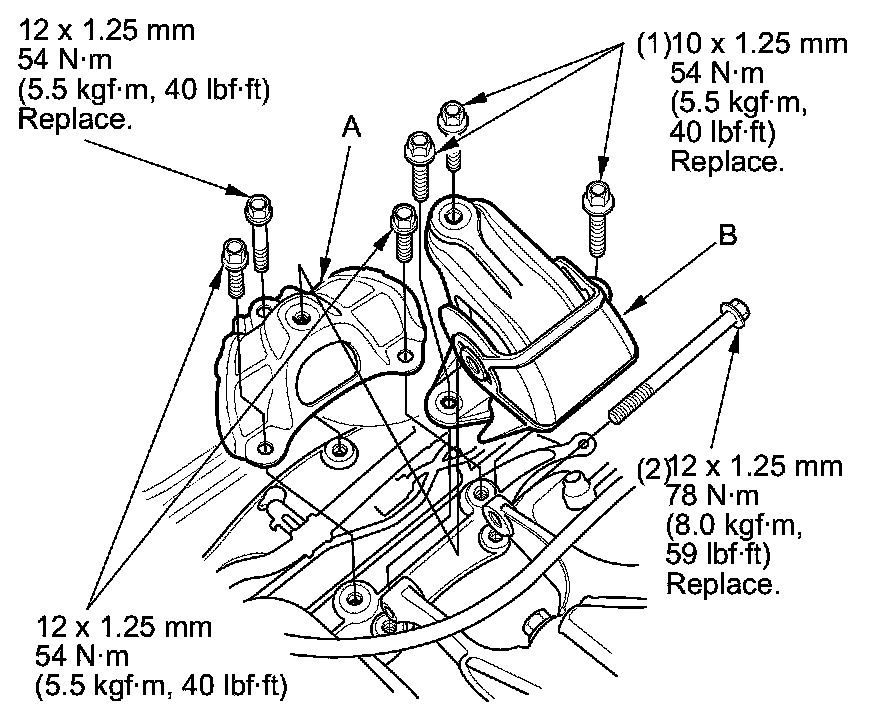 NOTE: Reinstall the mounting bolts/support nuts in the sequence given in the following steps. Failure to follow this sequence may cause excessive noise and vibration, and reduce engine mount life.