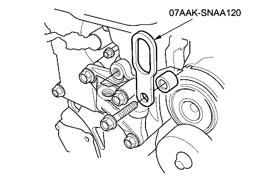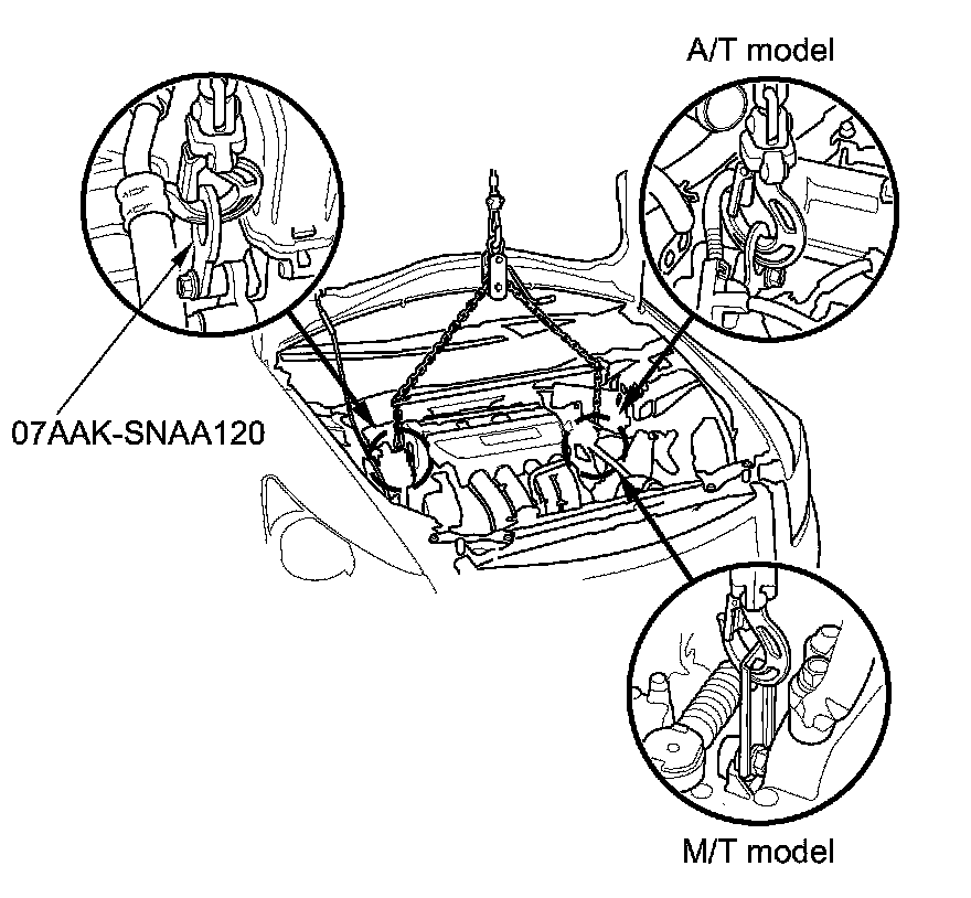 2. Raise the vehicle on the lift, and position the engine/ transmission under the vehicle. Lower the vehicle, and attach the universal lifting eyelet (07AAK-SNAA120) and the chain hoist to the universal lifting eyelet and the transmission hanger, then lift the engine into position in the vehicle.