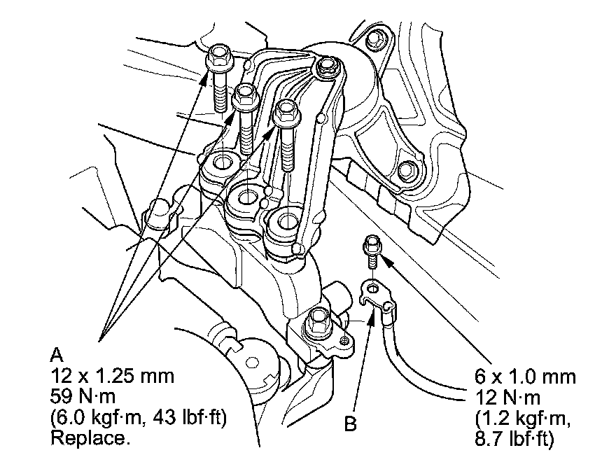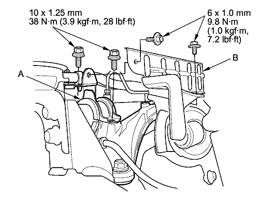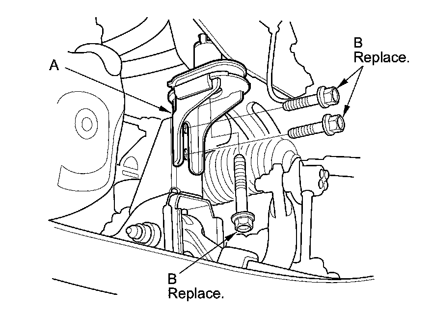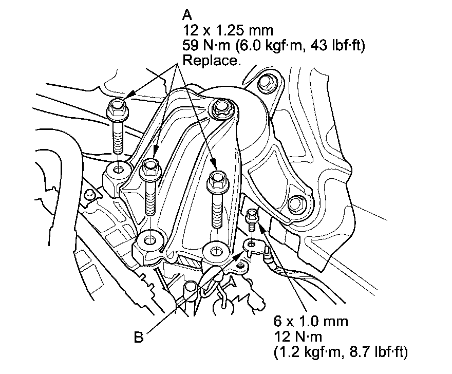 9. Install the side engine mount bracket (A), then tighten the new side engine mount bracket mounting bolts (B).