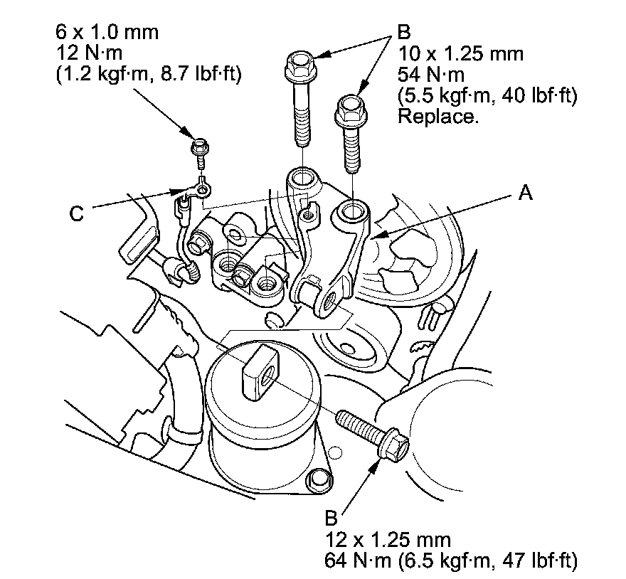 27. Tighten the new front engine mount mounting bolt (A), then install the front engine mount stop (B) and connect the vacuum hose (C).