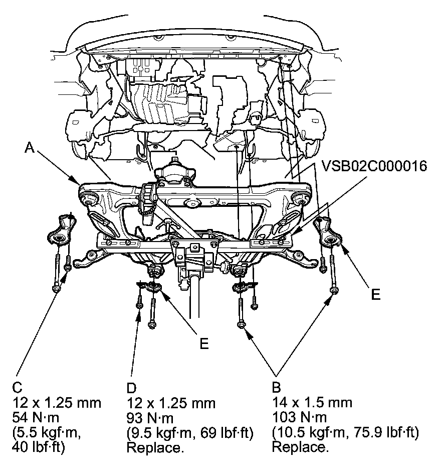 13. Loosely install the new front subframe mounting bolts (four) (B), the 12 x 1.25 mm bolts (four) (C) (D), and the stiffeners (four) (E).