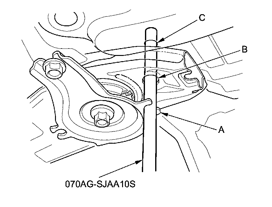 16. Insert the 15.7 mm side of the subframe alignment pin (070AG-SJAA10S) through the positioning slot (A) on the right rear stiffener, through the positioning hole (B) on the subframe, and into the positioning hole (C) on the body, then loosely tighten the subframe right rear mounting bolt.