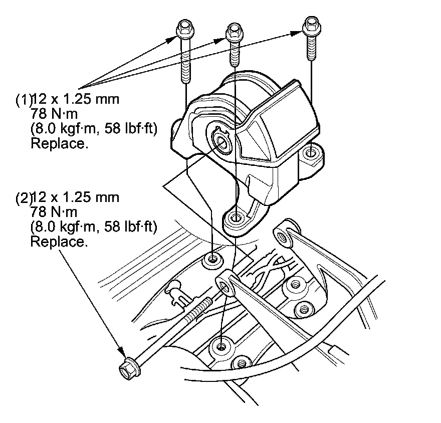 30. M/T model: Remove the jack, then tighten the new rear engine mount mounting bolts in the numbered sequence shown.