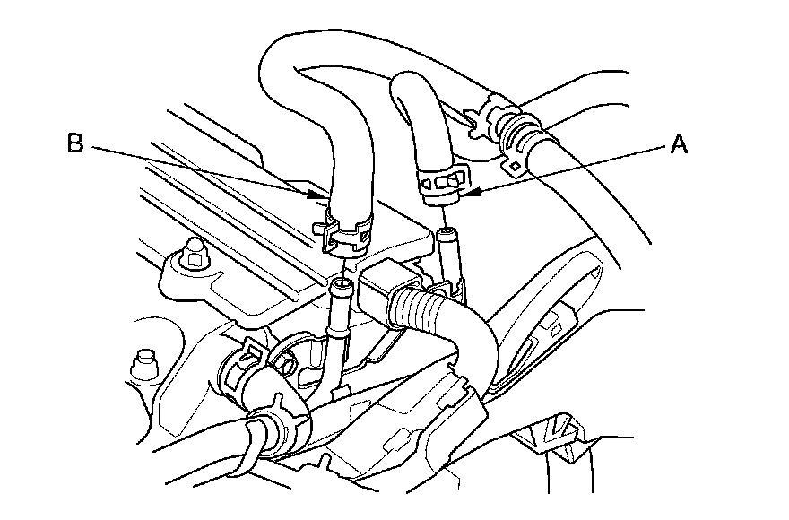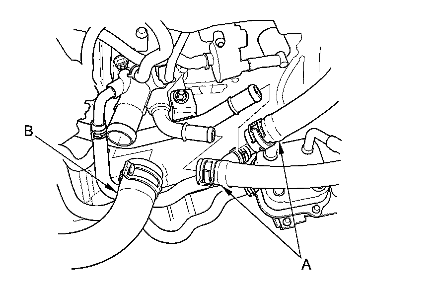 36. Connect the heater hoses (A) and the upper radiator hose (B).