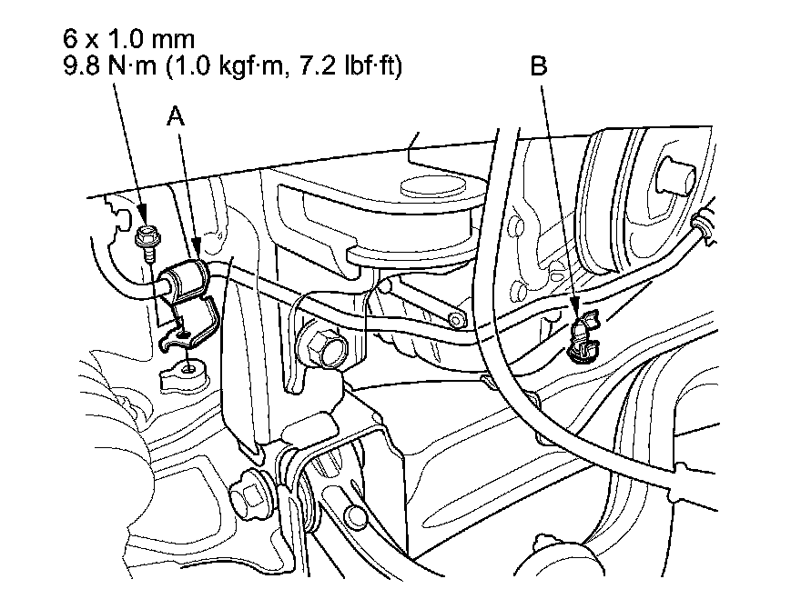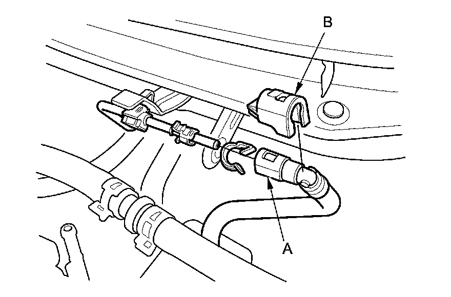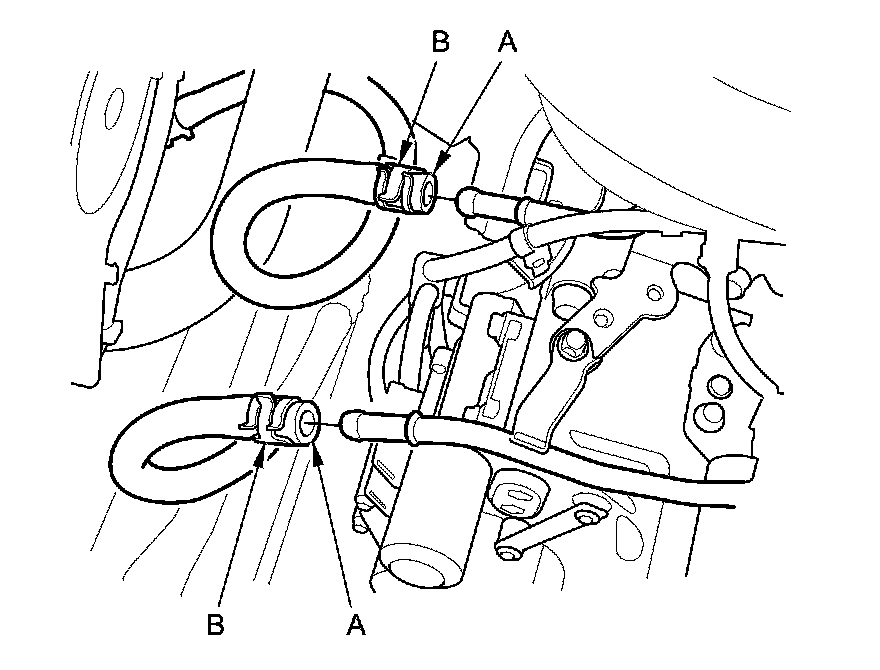 42. Install the power steering fluid line bracket (A), and clamp the power steering fluid line clamp (B) on the front subframe.