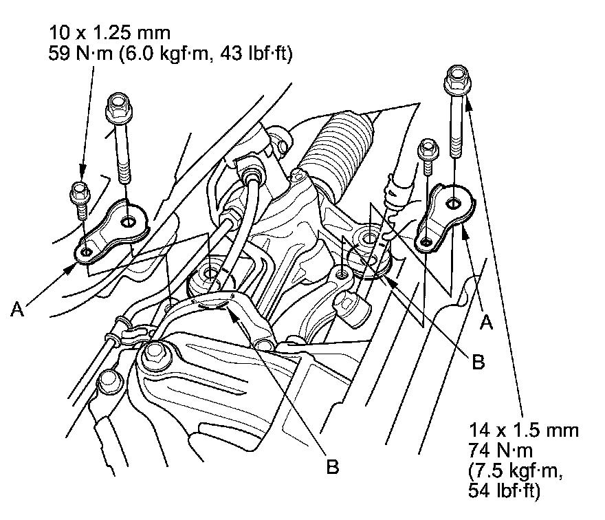 14. Install the subframe middle mount (A) on both sides, then loosely tighten the new subframe middle mount mounting bolts (B).