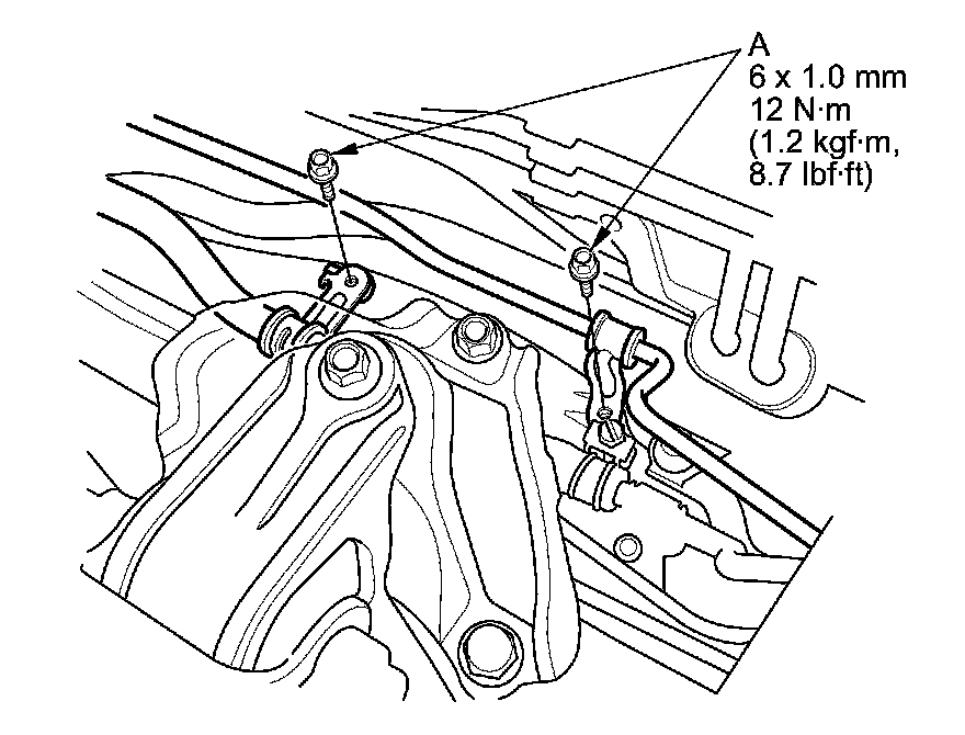 5. Tighten the new upper transmission mount bracket mounting bolts (A) to the specified torque.
