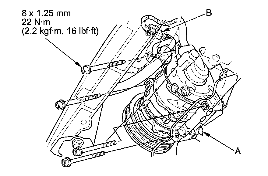 43. Install the A/C compressor (A), then connect the A/C compressor clutch connector (B).