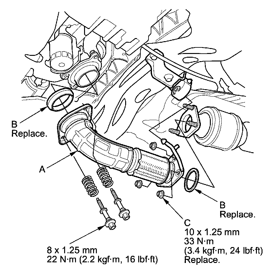 48. Install exhaust pipe A using new gaskets (B) and new self-locking nuts (C).
