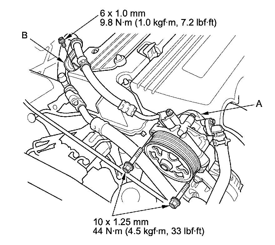 55. Install the power steering pump (A), and the power steering pump outlet hose bracket (B).