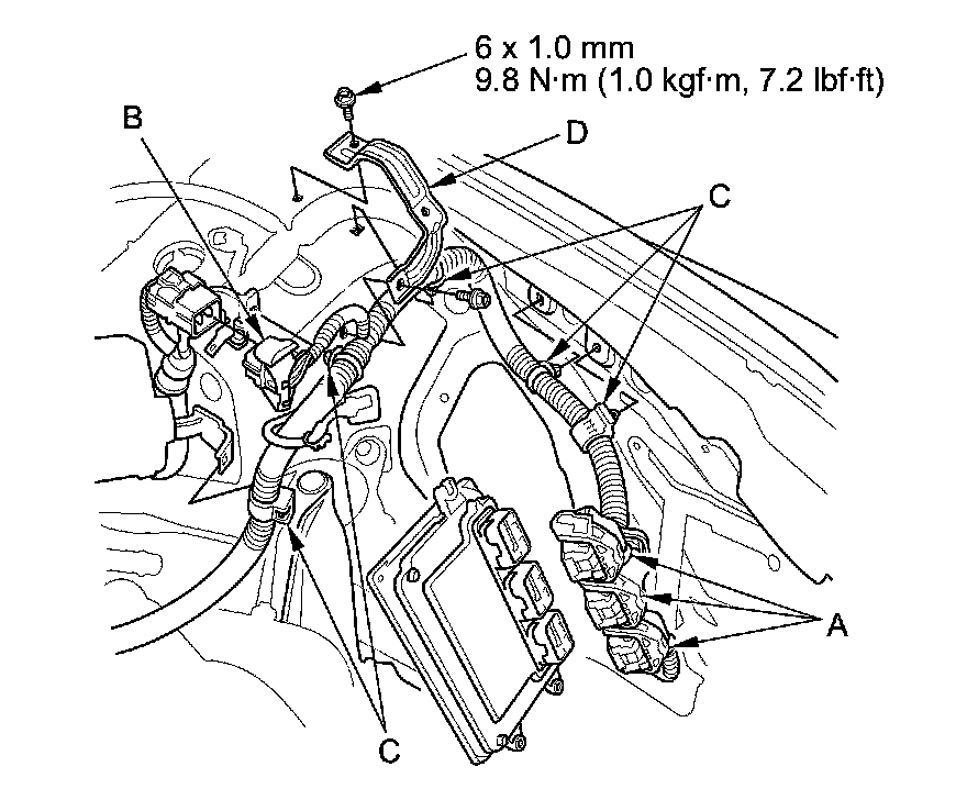 63. Connect the harness connector (B), and install the harness connector to the bracket (C).