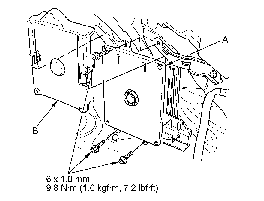 61. Install the ECM/PCM (A), then install the ECM/PCM cover (B).