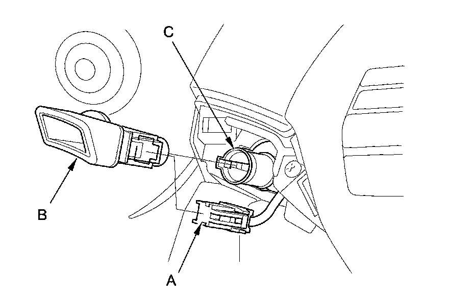 Disconnect the connector (A), and remove the in-car temperature sensor (B) from the air hose (C).