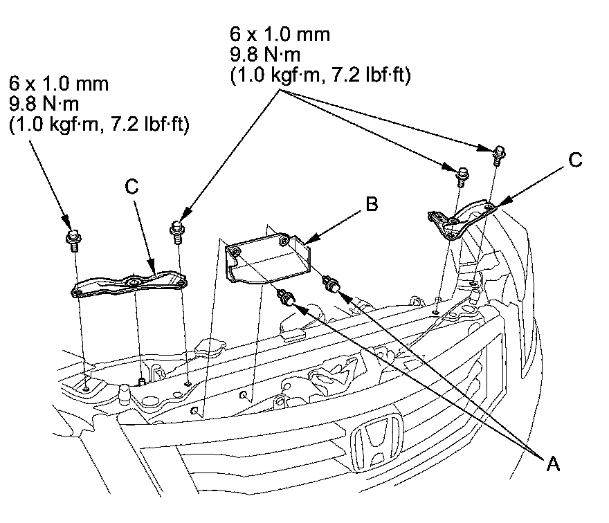 4. Remove the clips (A) and the air guide plate (B). Remove the bolts and the radiator upper mount brackets (C).