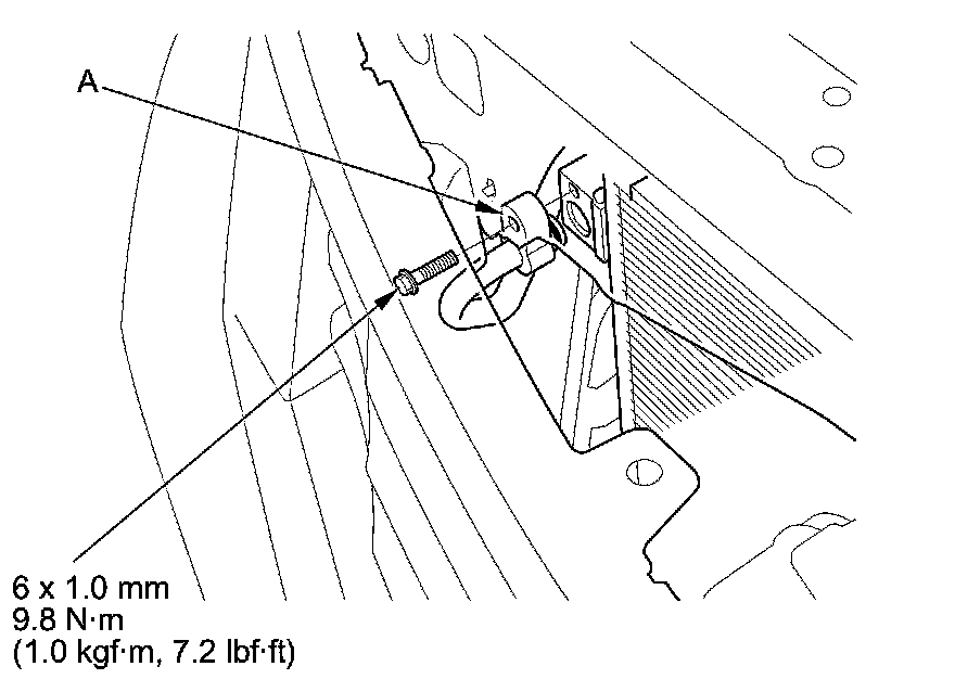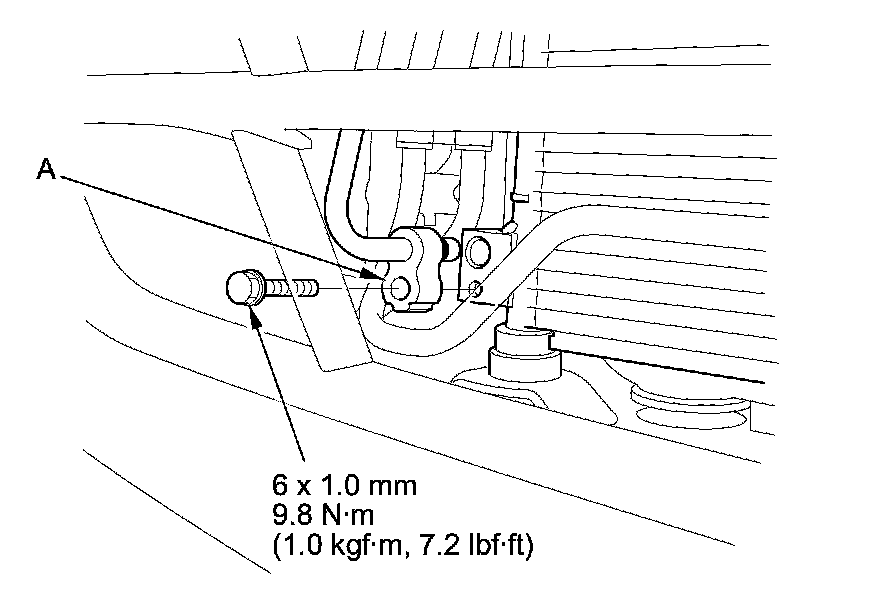 6. Remove the bolt, then disconnect the discharge hose (A) from the A/C condenser.