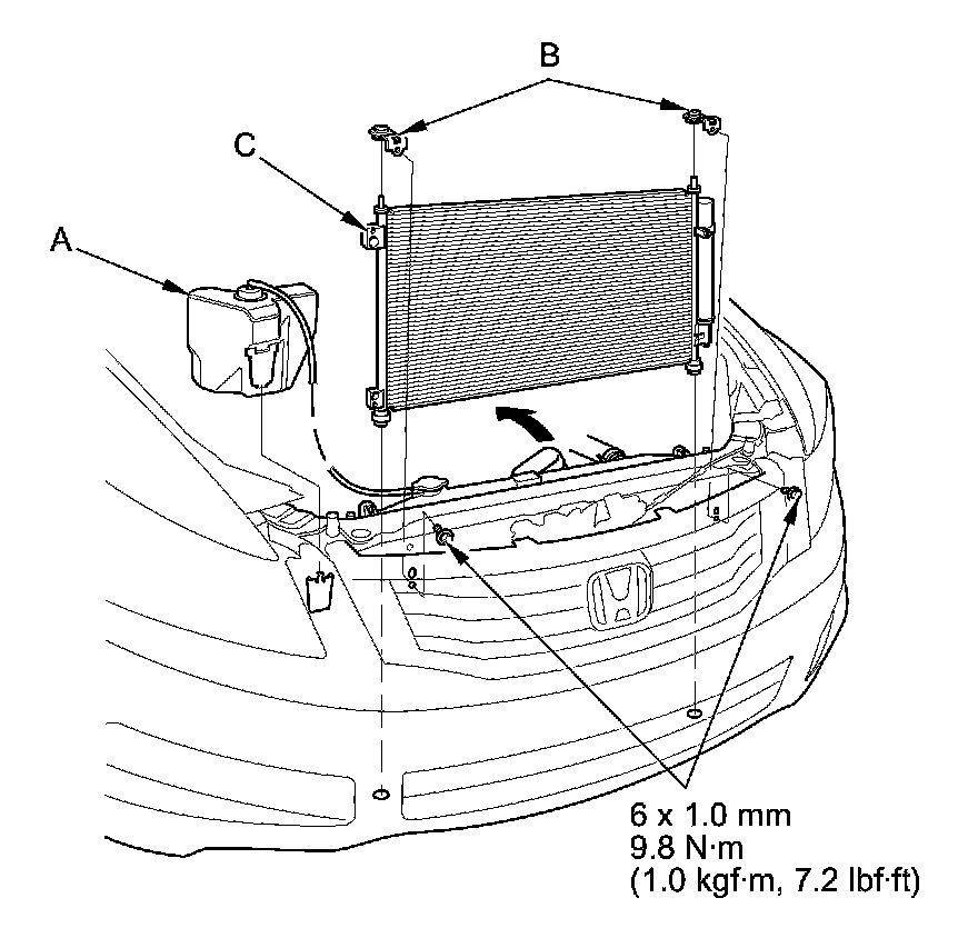 8. Remove the bolts, then remove the A/C condenser upper mount brackets (B). Remove the A/C condenser (C) by lifting it up. Be careful not to damage the radiator or A/C condenser fins when removing the A/C condenser.