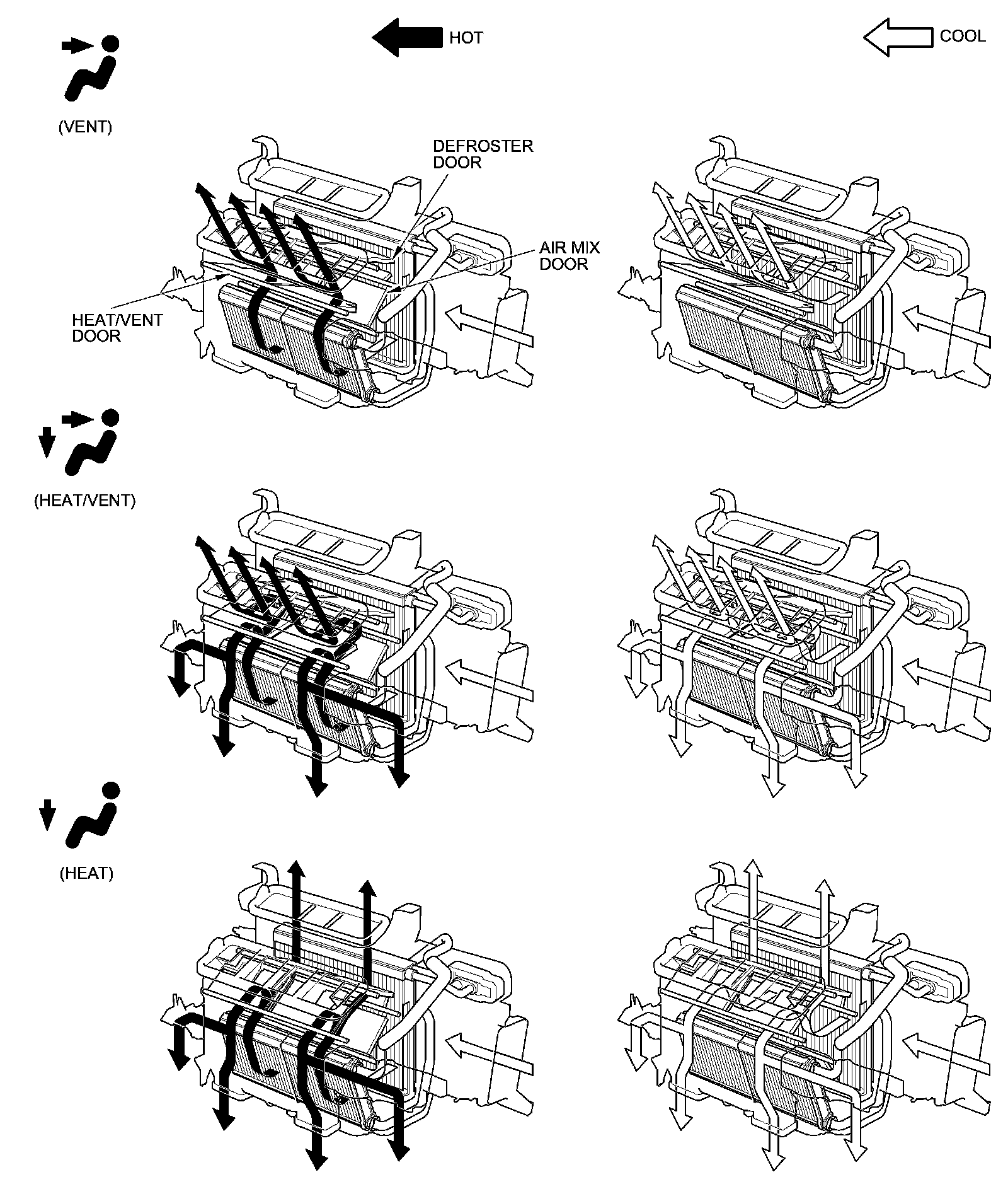 This system automatically controls the temperature and the vent mode of the air direction to the driver and passenger's side depending on the angle of the sun and the direction of the vehicle. It calculates information such as date, time, longitude, and latitude from the navigation system, as well as the radiant strength of the sun from the sunlight sensor, to determine the appropriate mode position and temperature to be directed to each side.