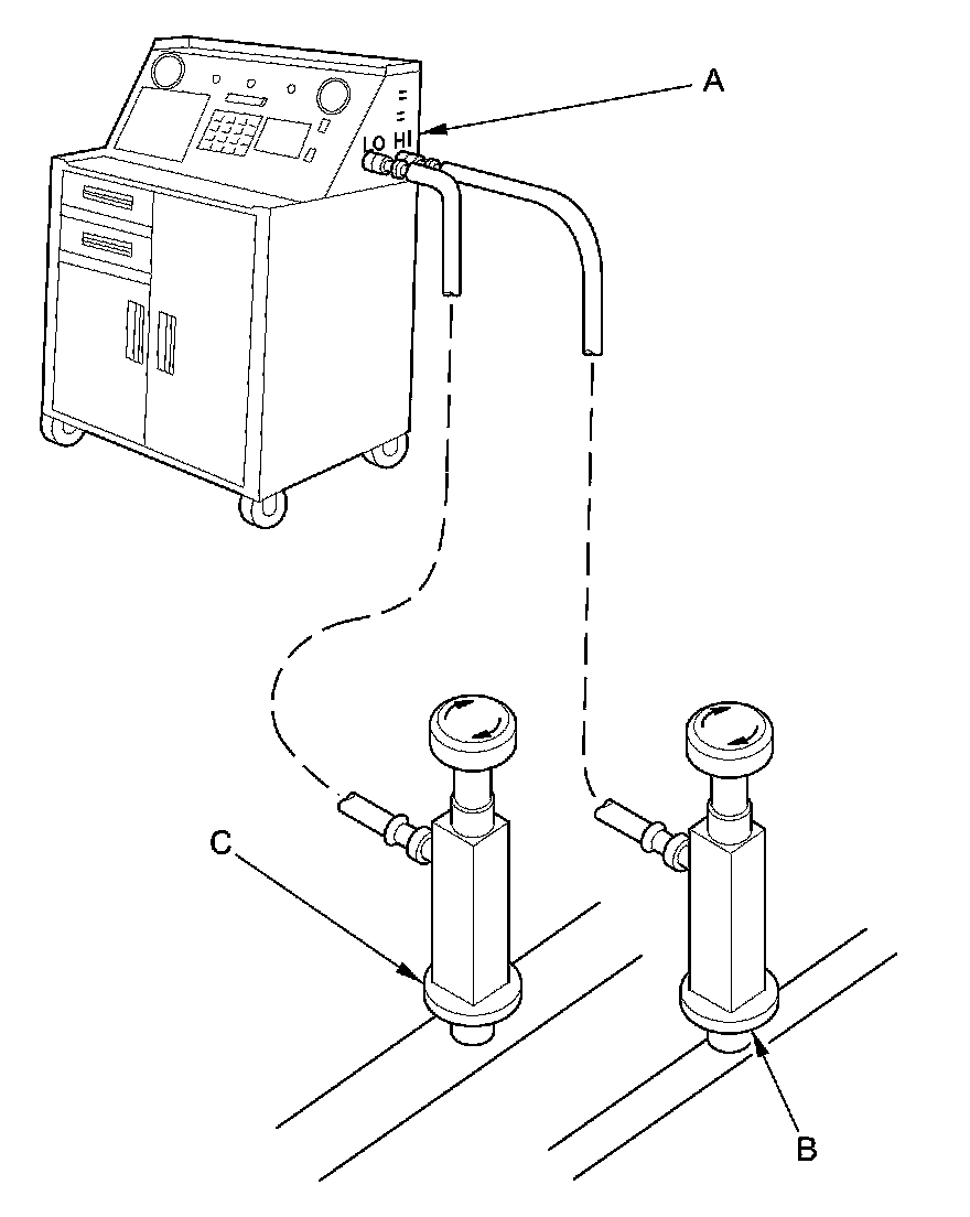 1. Connect an R-134a refrigerant recovery/recycling/charging station (A) to the high-pressure service port (B) and the low-pressure service port (C), as shown, following the equipment manufacturer's instructions.