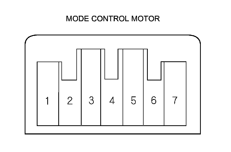 4. Use a digital multimeter with an output of 1 mA or less at the 20 kOhms range. With the mode control motor running as in step 2 Mode Control Motor Test (Without Climate Control (Models With A/T)), check for continuity between terminal No. 7 and terminals No. 3, No. 4, No. 5, and No. 6 individually. There should be continuity for a moment at each terminal as the motor moves through its travel.