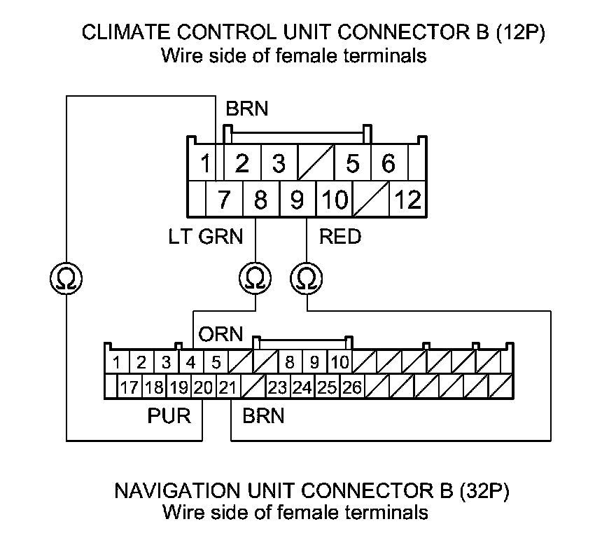 6. Check for continuity between the following terminals of climate control unit connector B (12P) and navigation unit connector B (32P).