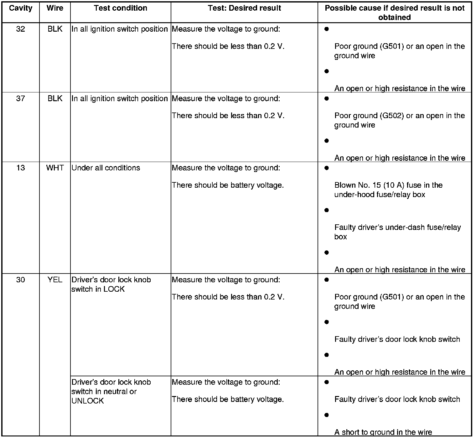 4. Reconnect the connectors to the driver's under-dash fuse/relay box, and do these input tests at the following connectors.