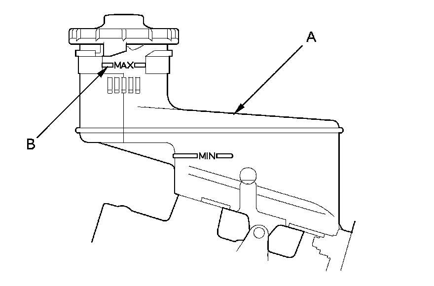 1. Make sure the brake fluid level in the reservoir (A) is at the MAX (upper) level line (B).