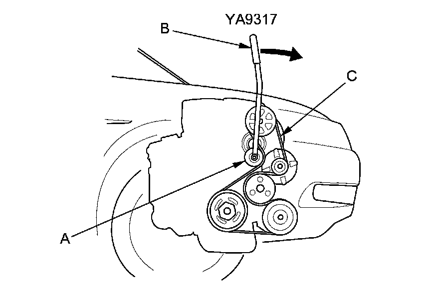 1. Move the auto-tensioner (A) with the belt tension release tool (B) in the direction of the rotation arrow to relieve tension from the drive belt (C), then remove the drive belt.